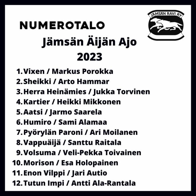 Valmentaja: Katja Luoma / Omistaja: Enon talli / Kasvattaja: Maarti & Joel Peuramäki / Hoitaja: Jari Autio